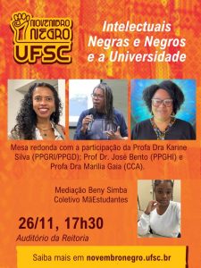 A mesa é promovida pela Coordenadoria de Relações Étnico Raciais (COEMA) em parceria com o Coletivo MãEstudantes da UFSC, e tem como objetivo de visibilizar as trajetórias de professoras e professores universitários negras e negros, seus desafios e conquistas no campo acadêmico e político.
