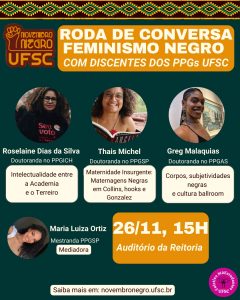 As discentes que integram os Programas de Pós-Graduação da UFSC partem dos referenciais teóricos de feministas negras para problematizarem por meio de argumentos críticos, fundamentados em conceitos destas intelectuais, mulheres negras, estadunidenses, da América Latina e de África apresentando as temáticas, Intelectualidades entre a Academia e os Terreiros, as Práticas Maternagens, Corpos, subjetividades negras e cultura ballroom . As estudantes articulam saberes/fazeres produzidos em espaços e territórios destacando como a experiência de vida, a ancestralidade e a resistência moldam perspectivas próprias de produção de conhecimento. O encontro também busca evidenciar a potência das epistemologias negras (re)criadas por mulheres, bem como, os desafios e insurgências que marcam a vivência acadêmica e comunitária de suas trajetórias.